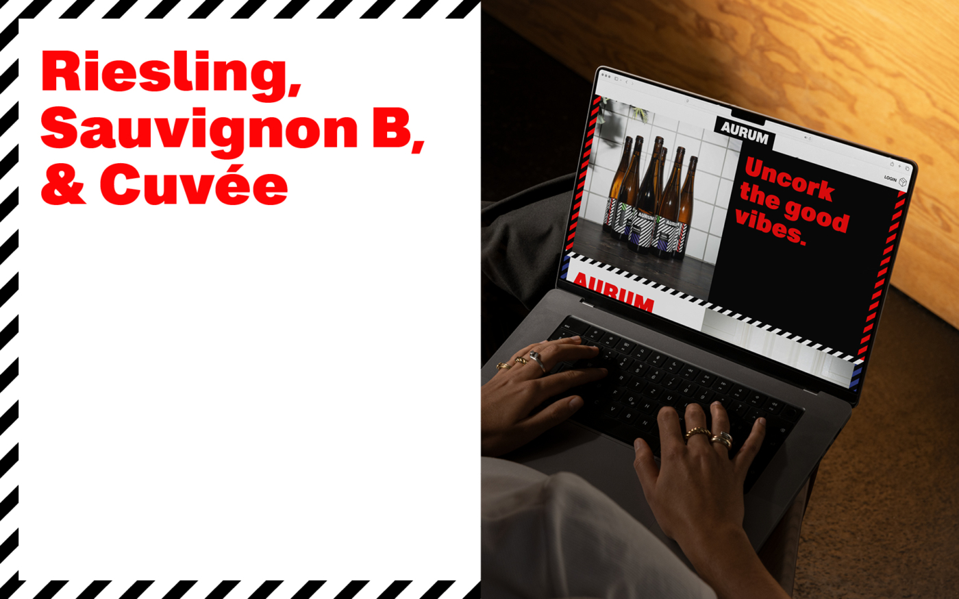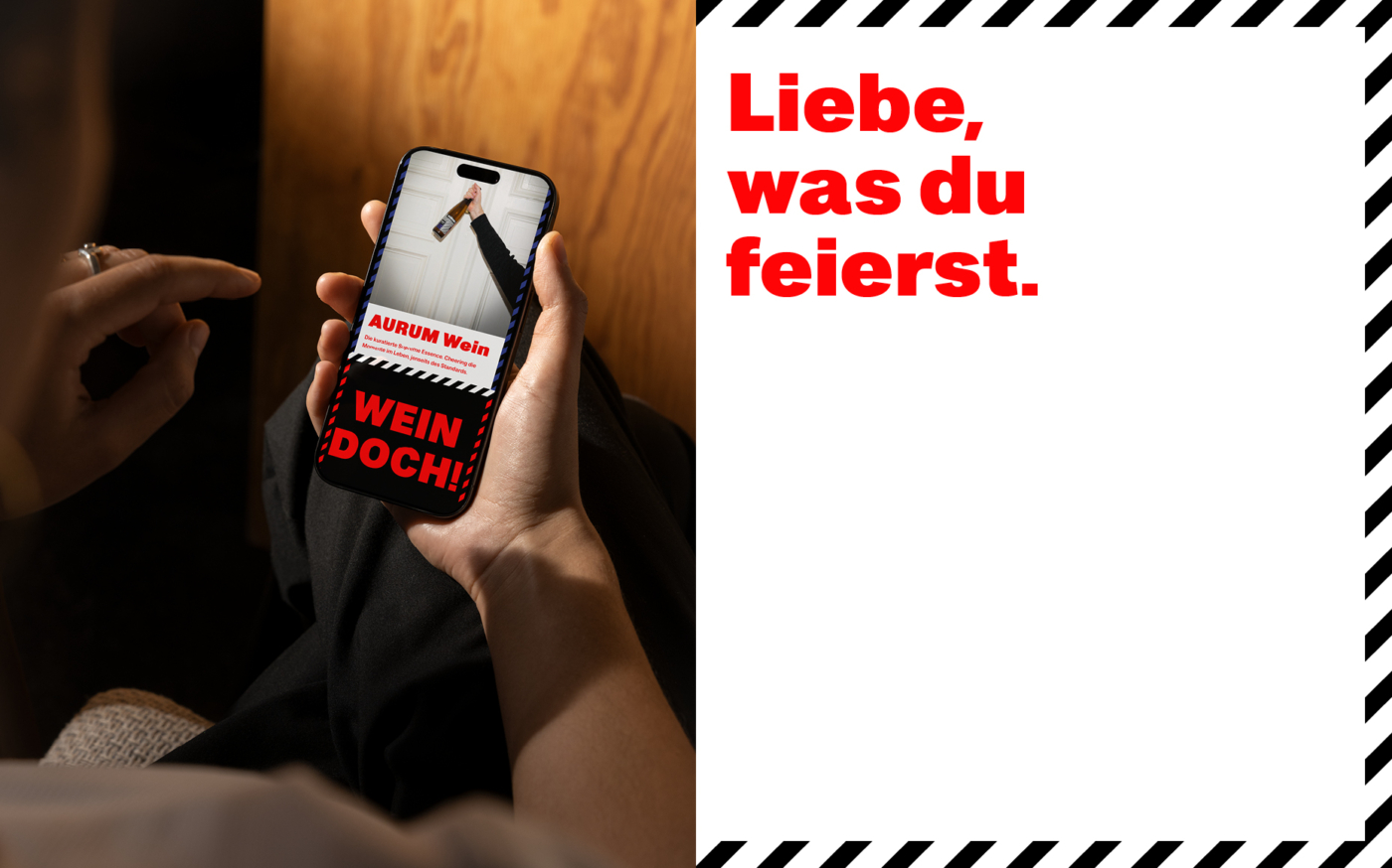 Wir entwickelten eine Markenidentität, die sich bewusst jenseits der gewohnten Bildwelten des Weinmarktes positioniert. Das visuelle Konzept kombiniert kontrastreiche grafische Muster, kräftige Typografie und markante Farbakzente zu einer progressiven Formsprache. Ergänzt wird das Branding durch prägnante Claims wie „Uncork the good vibes“, „Feier, was du liebst“ und „Es ist Zeit zu feiern“, die den kommunikativen Ausdruck der Marke verstärken. So entsteht ein klarer, mutiger Auftritt, der die Haltung von AURUM Wein transportiert und die Marke im urbanen Lifestyle-Kontext verankert.